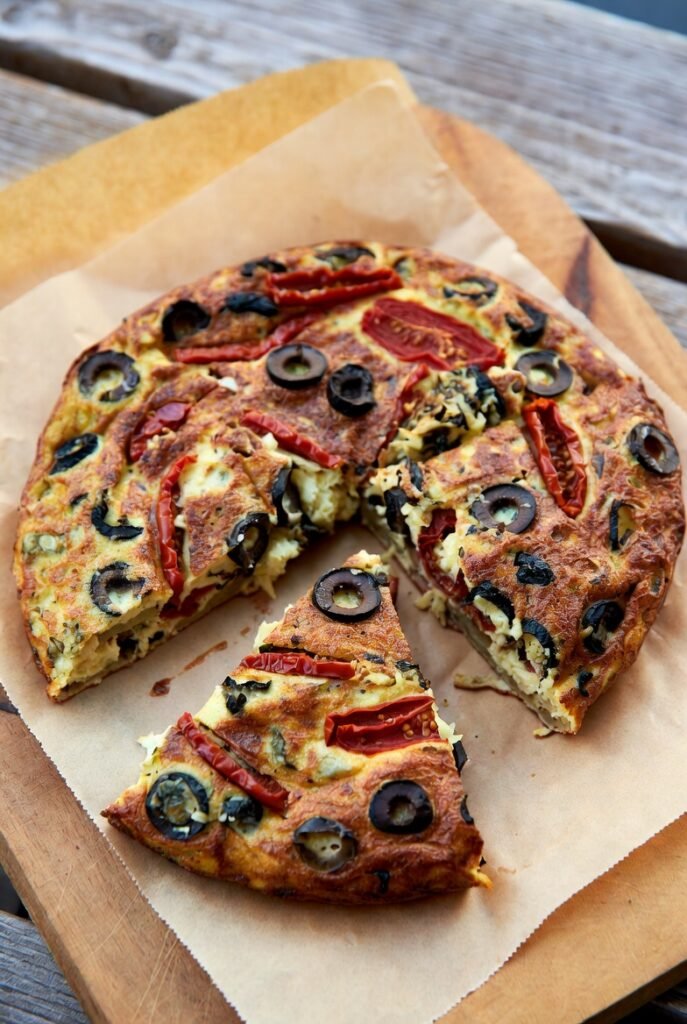 Salty olives and leathery sun- dried tomatoes add bold, savory notes. This frittata is perfect for lunch or regale and dyads well with a side of couscous or salad.