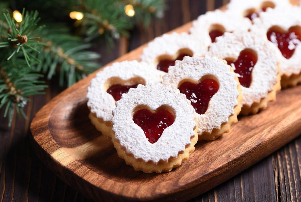 Linzer cookies are reasons with butter and almond-flavoured cookies with jam in the middle. The filling is brightly visible through the cut-out tops, making it a presentable and attractive treat during holiday events or as a present.