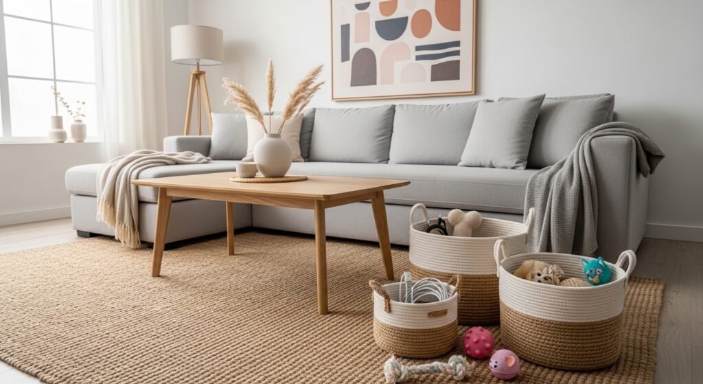 Tossing random items like loose chargers and dog toys into nice looking baskets hides the mess instantly when you have unexpected guests dropping by. This trick keeps your tables clear and gives everything a designated home without needing a perfect organizing system.