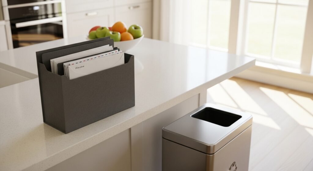 Throwing junk mail straight into the recycling bin the second you walk through the door stops paper from covering your kitchen island. Keeping only the important bills in a small folder keeps your mind clear and your surfaces totally spotless.