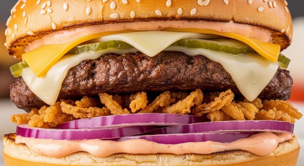 You get a double dose of onions with this new order because they use two different kinds. The mix of fresh slivers and crispy fried bits tastes very strong. This combination adds a satisfying crunch that makes the burger way more fun to eat today.