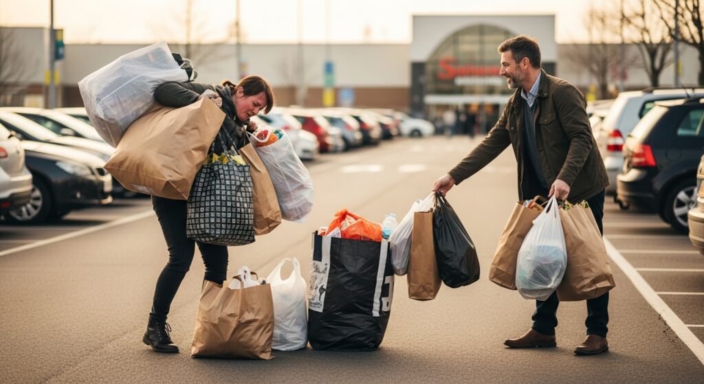 I had so many bags and made them look really heavy. People saw me and just came to help out. They took half the load so I could reach my car easily. It felt good to see that there are still such nice folks around.