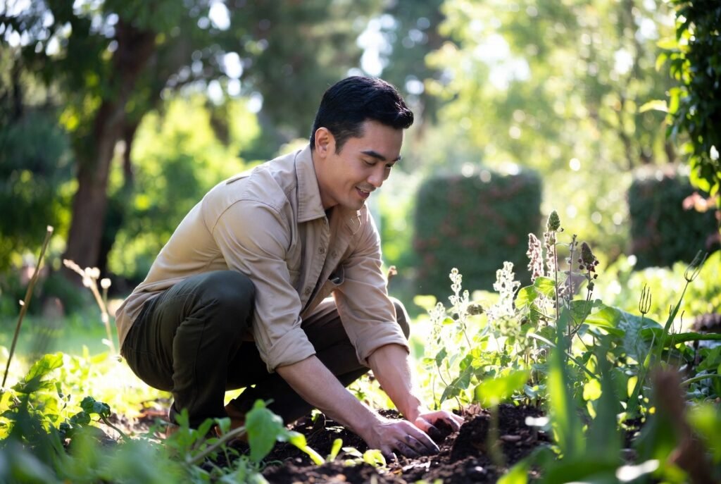 He farms or takes care of plants