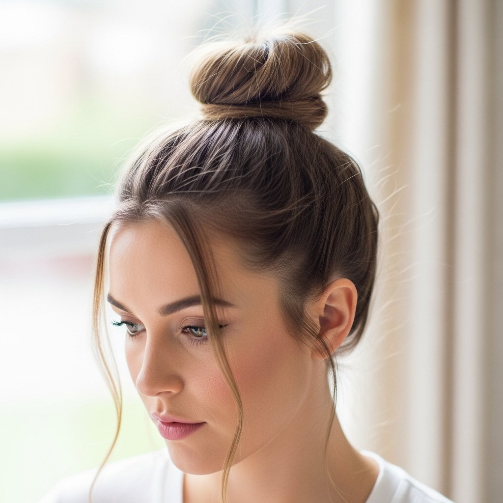A high bun can give the appearance of a longer face shape. It helps draw the eye upward away from the wider parts of the cheeks. This is a good option for a casual morning. Many people like how fast they can finish their hair.
