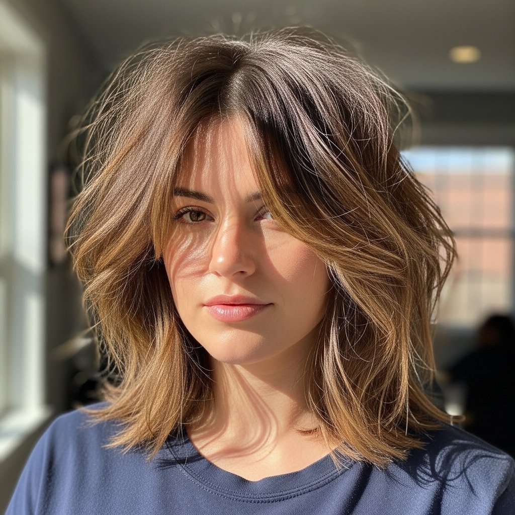 Hair that falls in layers below the chin can help a round face look longer. This style draws the eye down so your face shape feels more balanced. It is easy to take care of every day. People with medium hair often enjoy this.