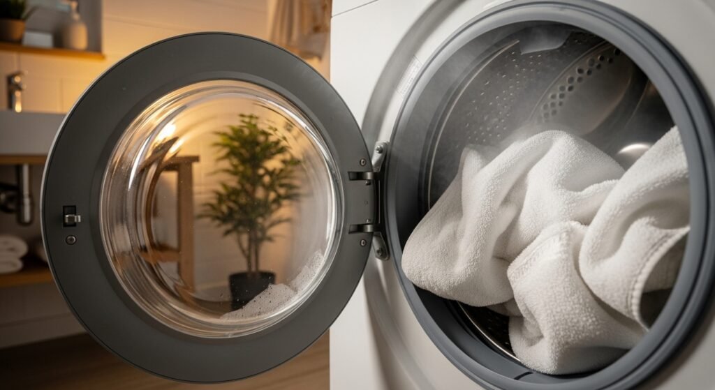 A towel keeps water trapped, often developing musty notes unless washed hard enough. Raising the temperature breaks down soap residue and unwanted microbes cold water fails to remove.