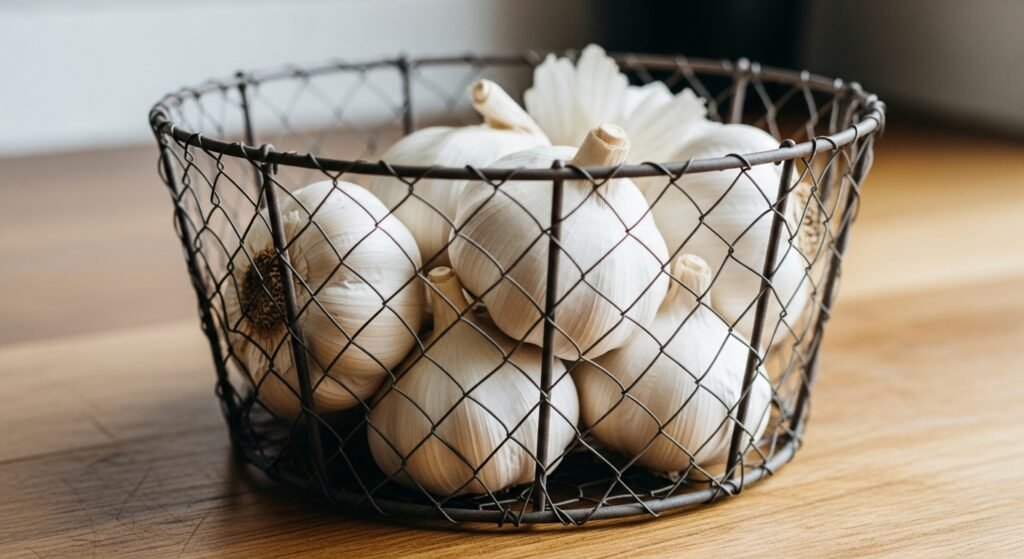 Try a wire basket or a mesh bag to keep your garlic bulbs fresh. These items let air flow around the garlic which is usually helpful for storage. You can also use an open paper bag instead. Air movement helps the garlic stay nice and firm.