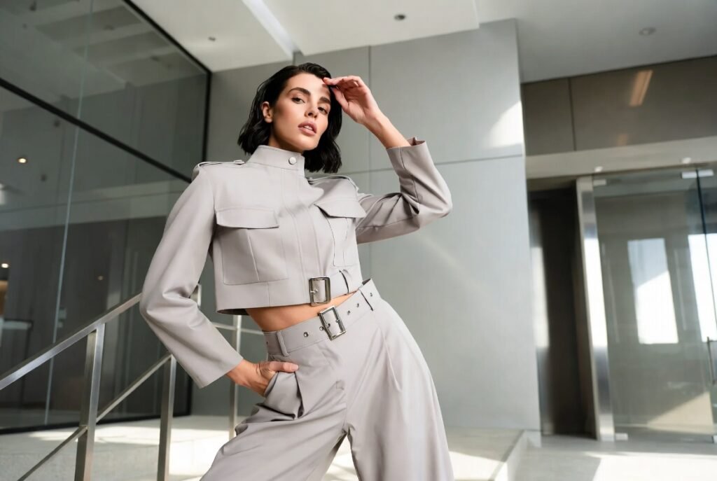 A structured jacket that is cropped at the waist and cuts well as high-waisted trousers. This is a mix which is modern and confident and still has a professional touch befitting meetings and the office atmosphere.