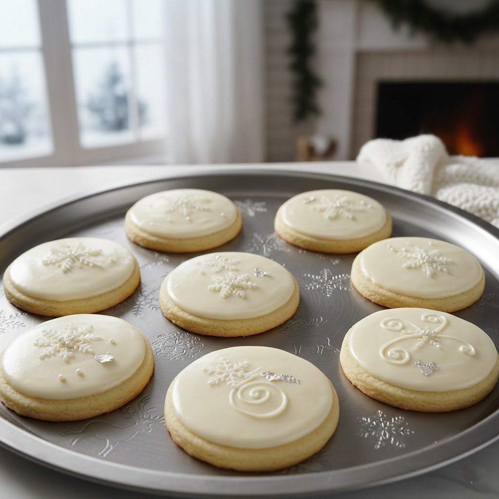 Sugar cookies that are snow white in colour, and light, delicate, and buttery texture. They are frosted pale and slick so that they resemble freshly fallen snow, and are a popular object for holiday trays. They also provide an ideal ground for the basic ornamental designs.