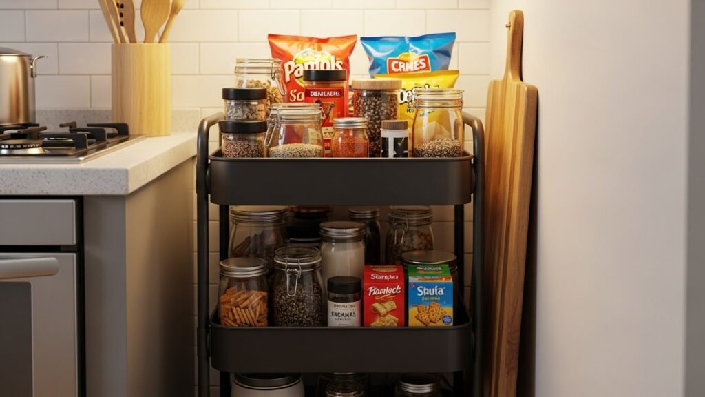 A narrow cart on wheels is a great way to use tight spots in your room. It fits into small spaces where nothing else goes. You can keep your spices or snacks on it. When you finish using it just slide it back out of sight.
