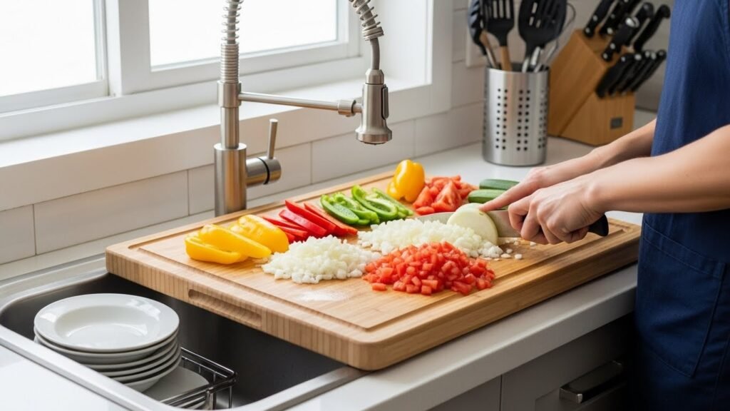 You can find cutting boards that are designed to sit right on top of your sink basin to give you extra prep space when you have no counter left. This is a total game changer for tiny kitchens because it turns a useless hole into a functional work area.