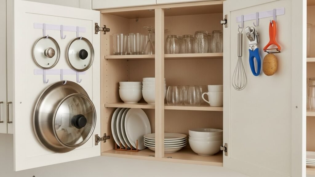 Sticky hooks on the back of your cabinet doors help hold many items. You could store pot lids or small tools there quite easily. This uses space that people often forget about in their homes. Keeping things tucked away helps your kitchen stay clean and very organized.