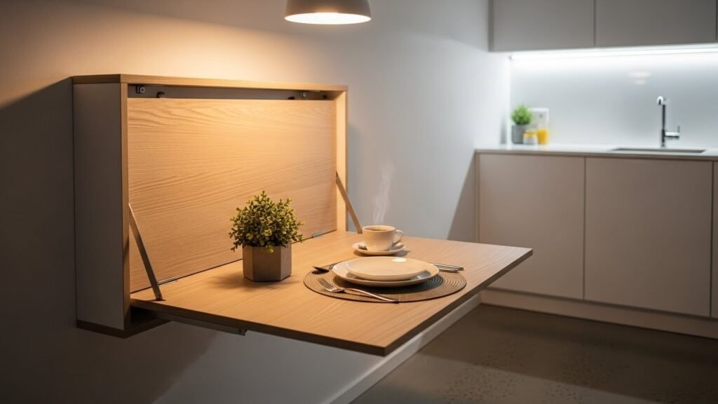 If your room is small you can use a table that stays on the wall. It folds down when you need to eat. This helps because it keeps the floor open while you cook. It is a simple way to make more space in your home.