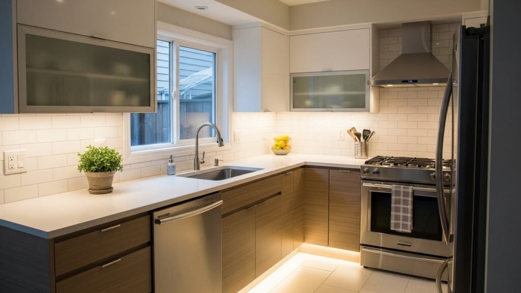 Small kitchens often feel dark and tiny. Adding lights under the top cabinets helps a lot. It makes the counters easy to see. This change helps the room look bigger by removing shadows. You might enjoy how much more open the whole cooking area feels now.