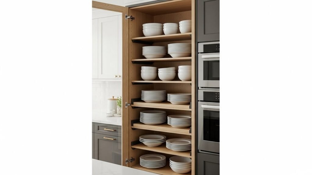 Putting small racks inside your tall cabinets helps you find more room for dishes. You can stack your plates and bowls on different levels. This keeps everything neat so you do not have to pull out a huge leaning pile of heavy plates.