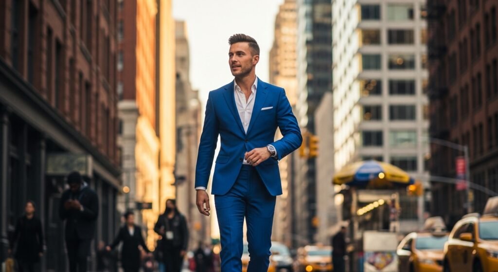 This is a very intense blue that is way brighter than navy and it really stands out in a crowd. Men are wearing this specific color on sweaters and even tailored suits to make a strong statement.