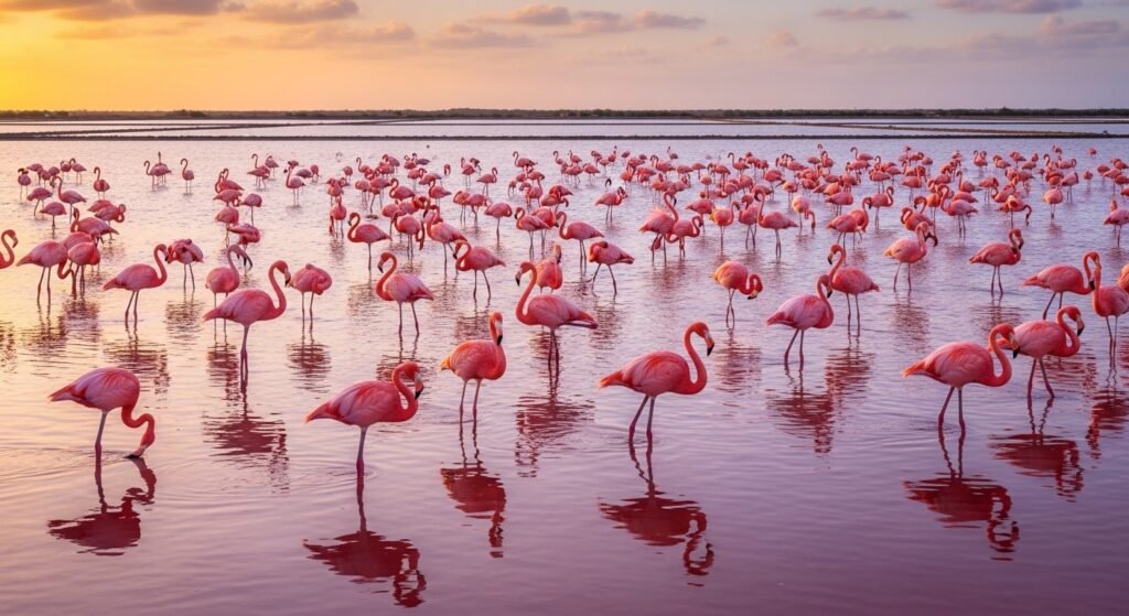 Many pink flamingos make their homes on the flat lands of this island. They gather in giant groups to nest and stay safe. There is a special sanctuary just for these birds. You can watch them standing in the water from a distance.