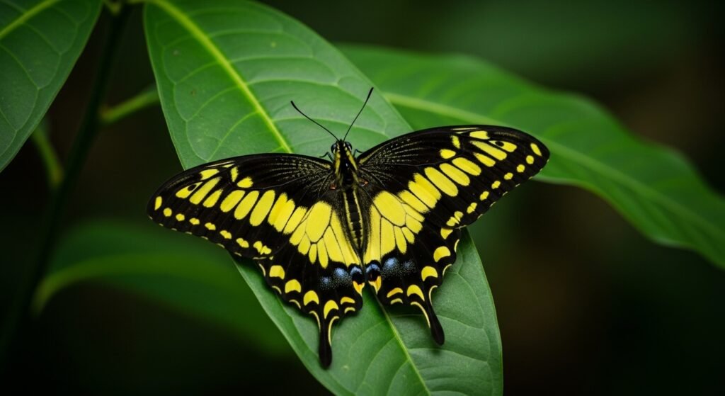The Homerus Swallowtail is a massive insect from Jamaica. It stays deep in the forest where it is quiet. Its wings are black with bright yellow marks. It is the largest butterfly in this half of the world. Seeing it is amazing.