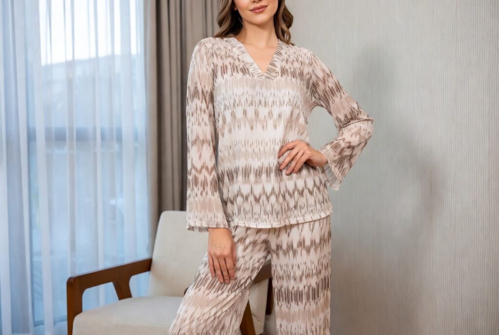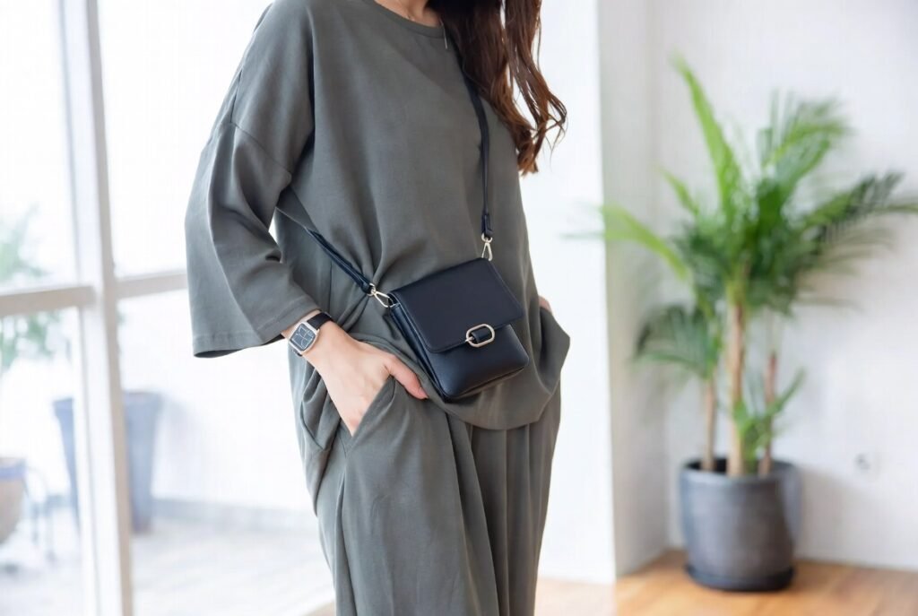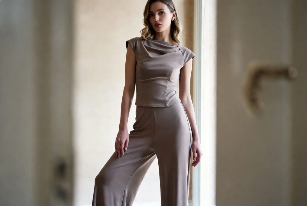 It is a coordinated top and pants set that is smooth and fashionable. Flowy material or soft tailoring makes it comfortable, and corresponding colors make it appear purposeful. You will even feel like you are in your lounge wear yet look completely dressed.