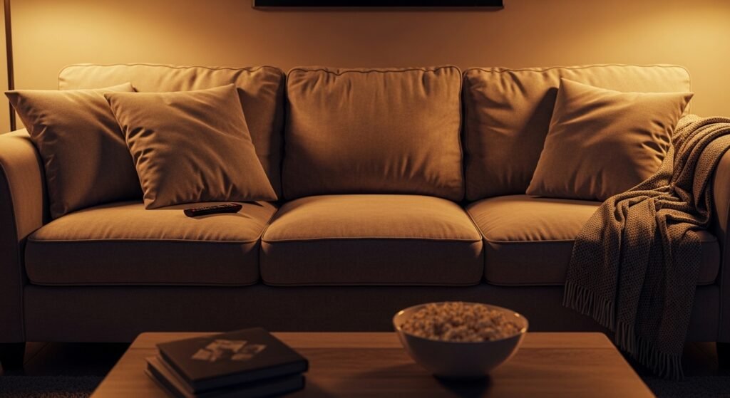 Soft and worn fabric means that people actually sit there to relax and watch movies together. It invites people to get comfortable without worrying about ruining a stiff new sofa.