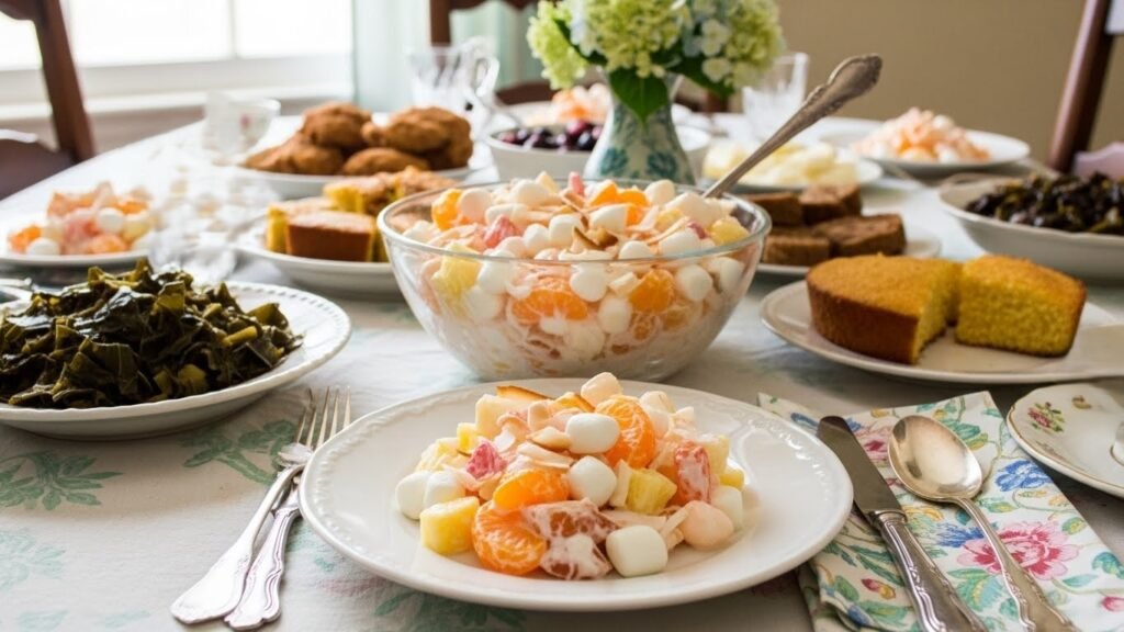 Ambrosia was often made with pineapple, coconut marshmallows and soft cream mixed together. It felt light and comforting at family gatherings. Over time people slowly stopped serving it as a regular side dish anymore today.