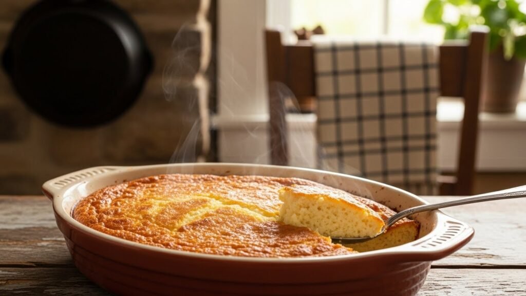 Spoonbread has a soft texture that reminds people of corn pudding mixed with a light bake, a dish linked to Virginia traditions, usually placed on the table beside fried chicken or stews during simple meals.