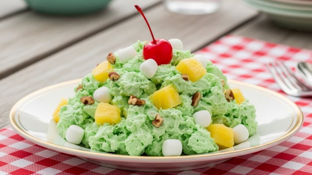 You only need pistachio pudding marshmallows and pineapple to create this bright green dessert that people call a salad. It has a funny name and a very sweet taste that was once a requirement for any proper Southern picnic.