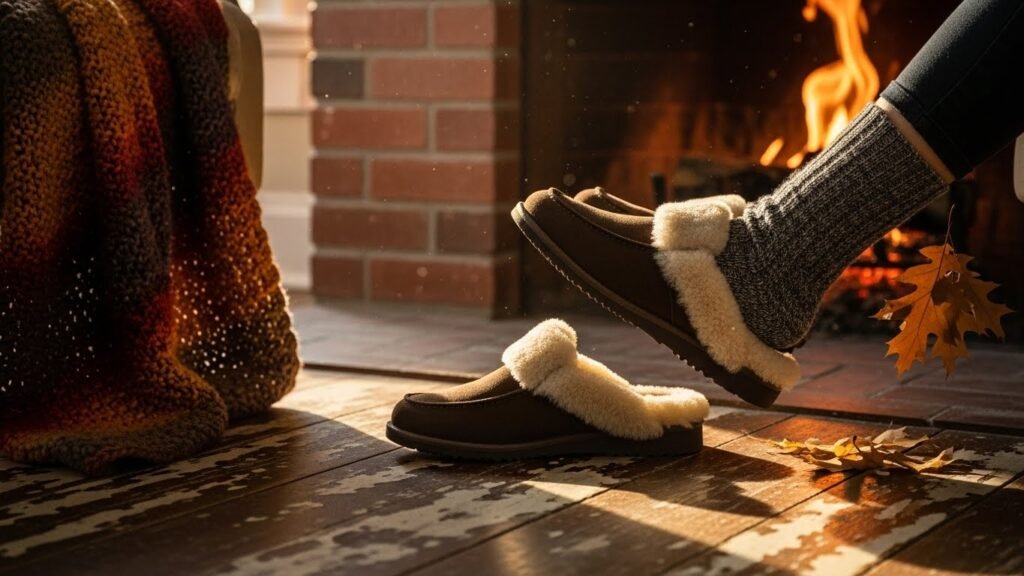 Since more people are spending time working from home stylish indoor mules with shearling linings have become a major trend for staying warm. They offer much more support than a standard slipper but are just as easy to kick off when you are ready to relax.
