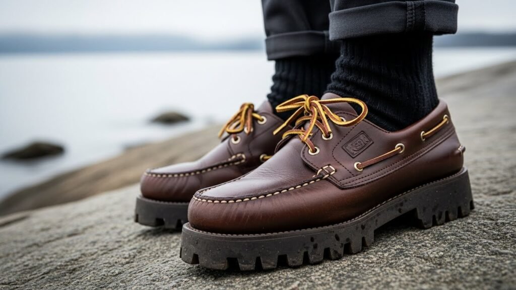 Traditional boat shoes are getting a fall makeover with heavy lug soles that handle slippery surfaces much better than the thin summer versions. This update lets you keep that nautical look well into the cooler months while adding a bit of extra height.