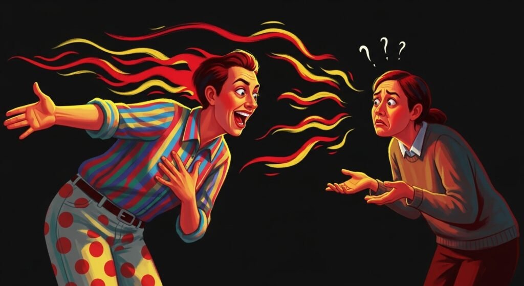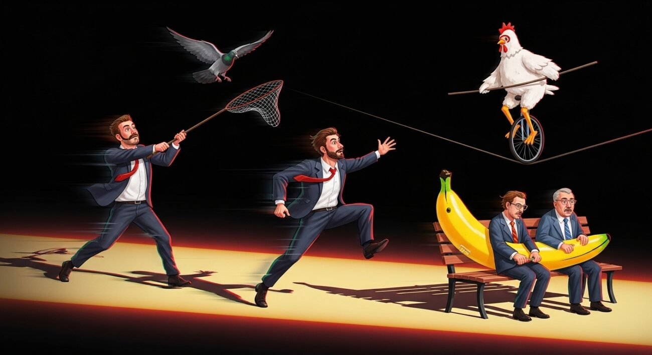 Drop a yellow tennis ball on the ground. Suddenly run after it while making huge loud crying noises like you lost a best friend. People nearby will look at you with so much total confusion and deep concern that you might actually start laughing yourself.