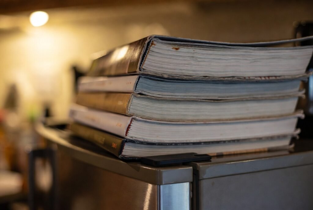 Coverings can be twisted, bindings can be unscrewed, pages can be oily, hot and damp. The shelf above the refrigerator is expected to age with cook books in a shorter time than other cook books in shelves. The pages can also be glued or curled in moisture.