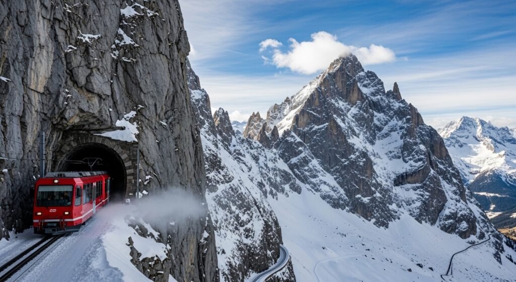 You can take a very special train through a long tunnel inside a big mountain. This path leads you to the famous Jungfraujoch station. It is over three thousand meters high in the sky. This is the highest place a train can go in Europe.