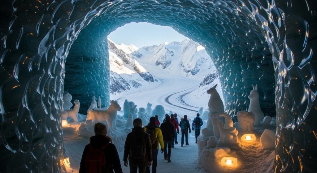 The last train goes through a dark tunnel inside the rock. You will finally reach the famous Jungfraujoch station. This place is way up in the cold air. It is more than three thousand meters high. This is the highest train station in all of Europe.