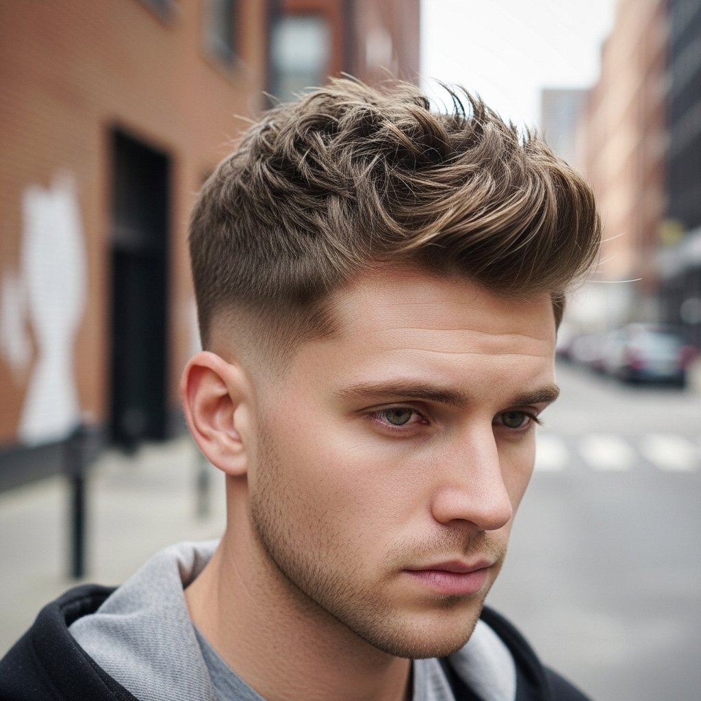 A high fade on the sides can actually make the hair on top look more substantial because of the way the lengths transition. When the sides are very short the recession at the top doesn’t stand out nearly as much as it would with longer hair.