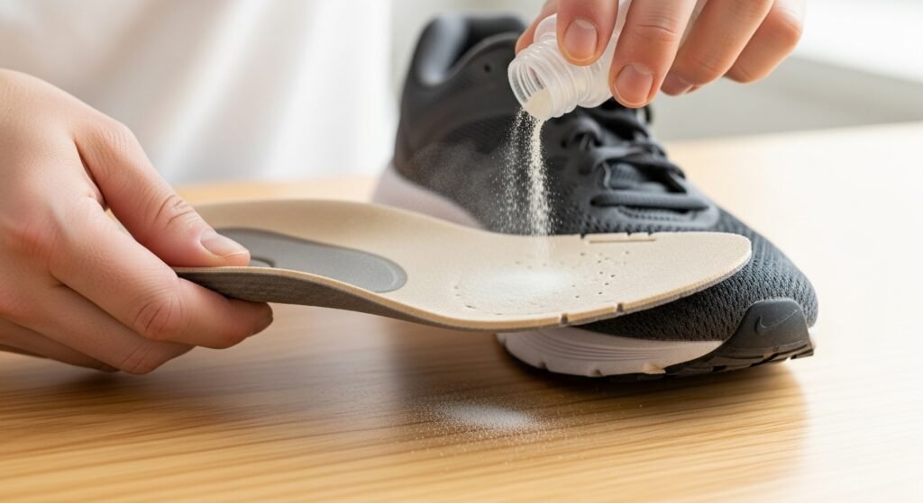 A noisy shoe can be fixed by using a bit of powder under the lining. You just pull up the inside part and sprinkle it on. This helps because it stops the pieces from sticking together. It is a simple way to keep things dry and quiet.