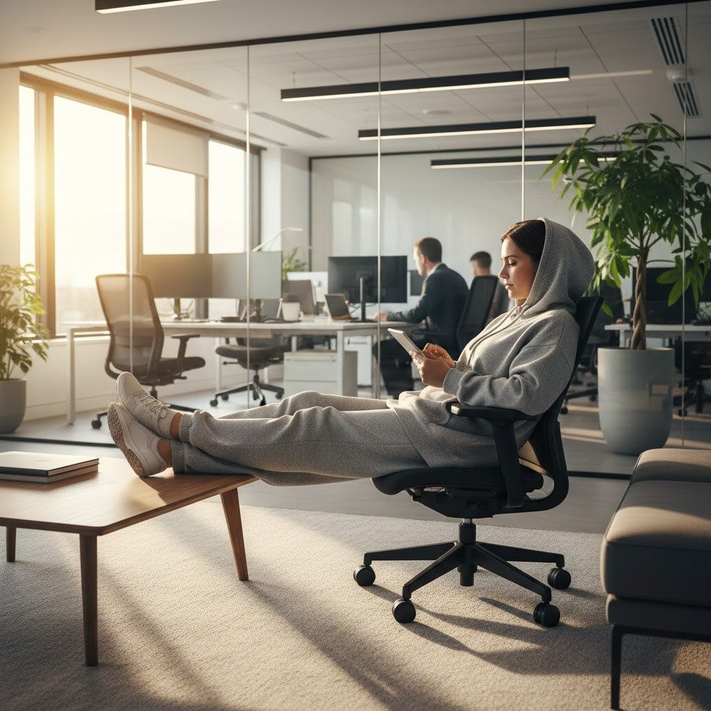 On the one hand, some modern offices are cozy, on the other hand, oversize and tattered hoodies may be too casual. Organized sweaters, cardigans, or jackets can also be as comfortable and still look purposeful and appropriate to a workplace.